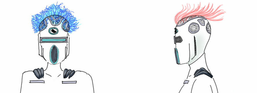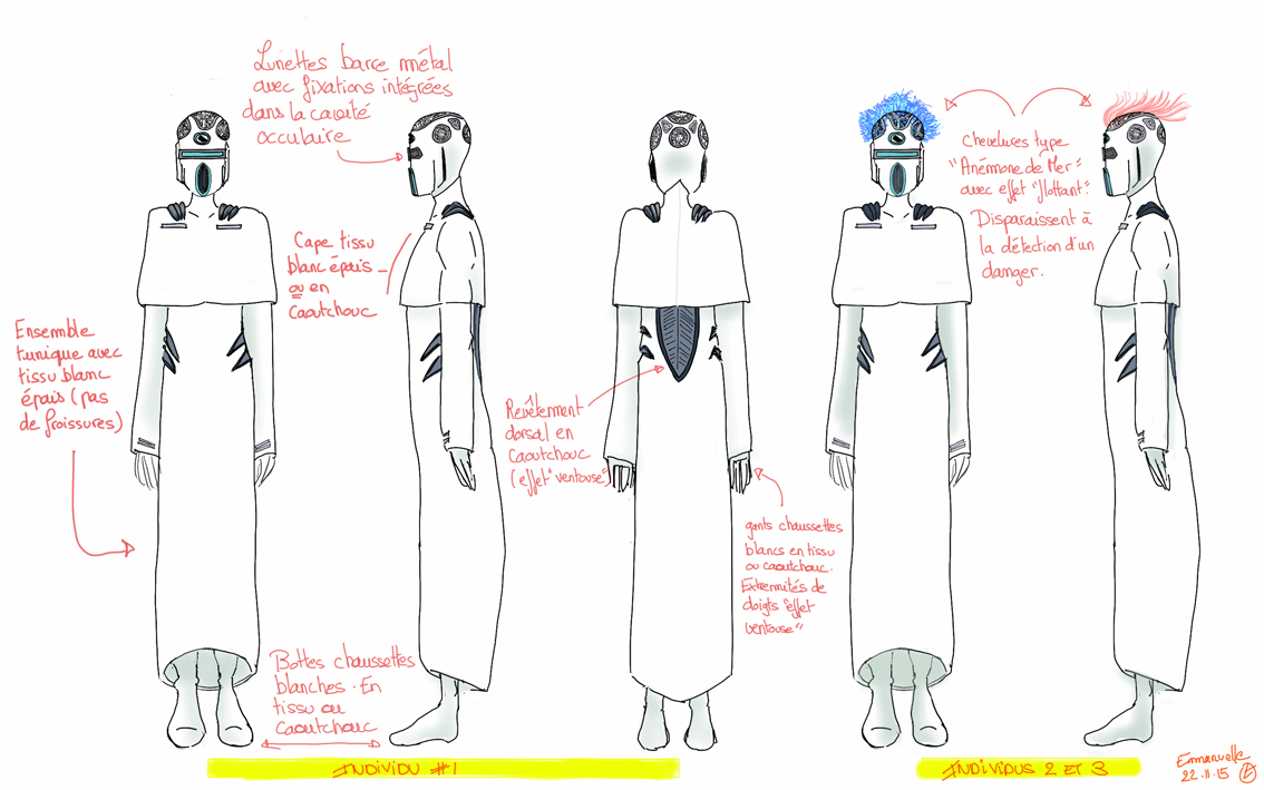 De fils en aiguille (toujours!), j’ai dessiné les traits d’un personnage au premier abord assez froid, avec des codes se référant aux univers aquatiques et étanches. Au vue du style assez neutre, j’en ai conclu que ça pouvait très bien faire l’affaire d’un peuple lambda et non le costume caractérisant les traits d’ un seul personnage. Alors, pourquoi ne pas s’éclater à customiser leurs cheveux pour leurs apporter une touche de fantaisie?