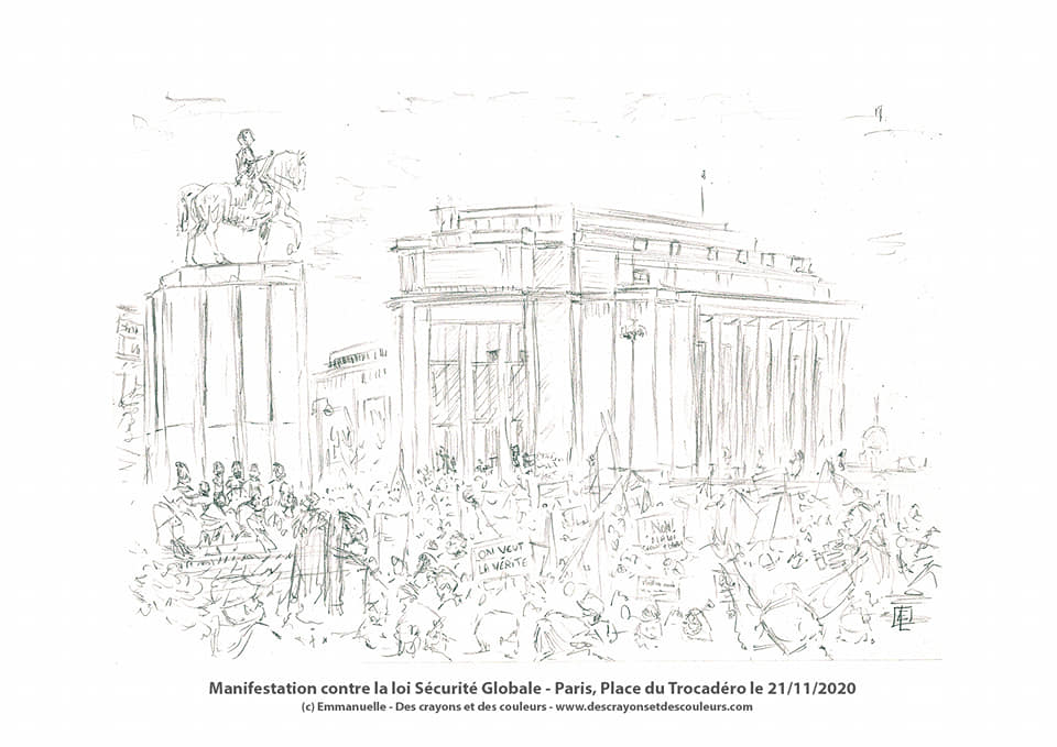 C’est dans cette optique que je me suis rendue au Trocadéro et à la Marche des Libertés. Ci-dessous, vous trouverez le crayonné effectué Place du Trocadéro. L’encrage sera réalisé ultérieurement.