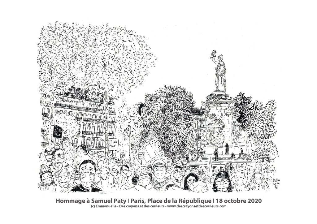 Comme beaucoup de citoyens anonymes, il m’est apparu nécessaire de soutenir le corps enseignant et la liberté d’expression après le tragique assassinat de Samuel Paty. Je me suis rendue au rassemblement du 18 octobre, tenu sur la Place de la République. Voici l’illustration que j’ai pu encrer. La mise en couleur arrive bientôt.